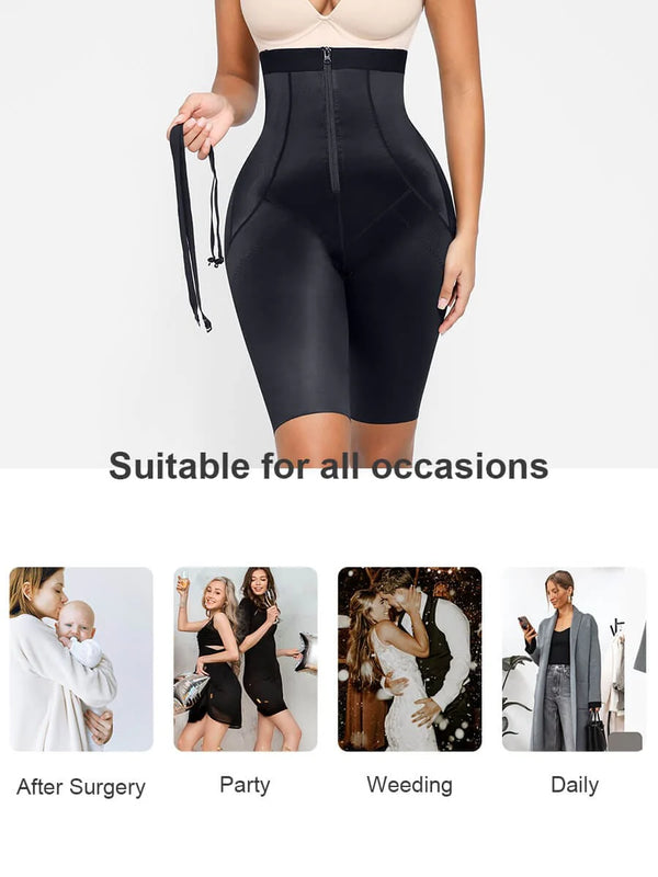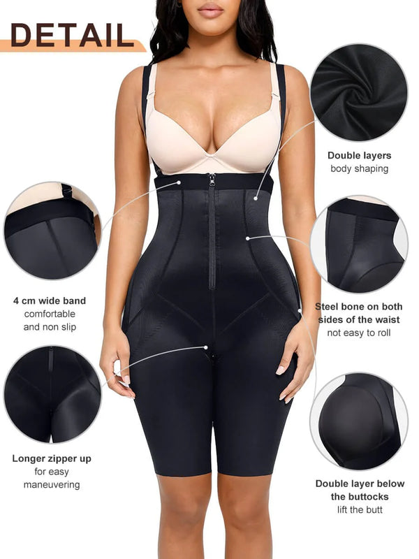 High-stretch hip panels adapt comfortably to different curves, and double-layer fabric beneath the buttocks enhances lift naturally. Finished with detachable adjustable straps, free-cut leg openings for an invisible finish, and a long crotch zipper for easy bathroom access.