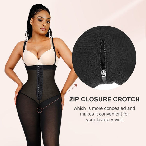 The open-bust design lets you wear your own bra while benefiting from built-in lift and supportive side shaping. A discreet zip crotch allows easy bathroom access, and three rows of hook-and-eye closures provide adjustable compression as your body changes.