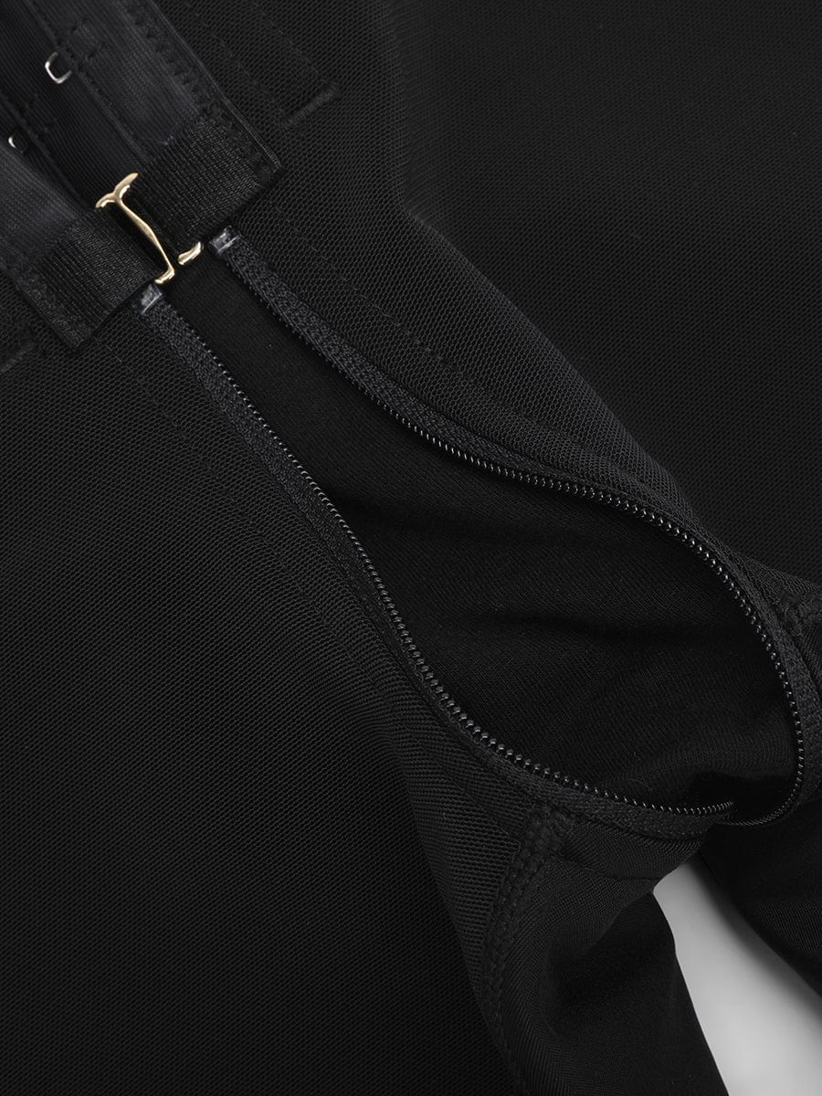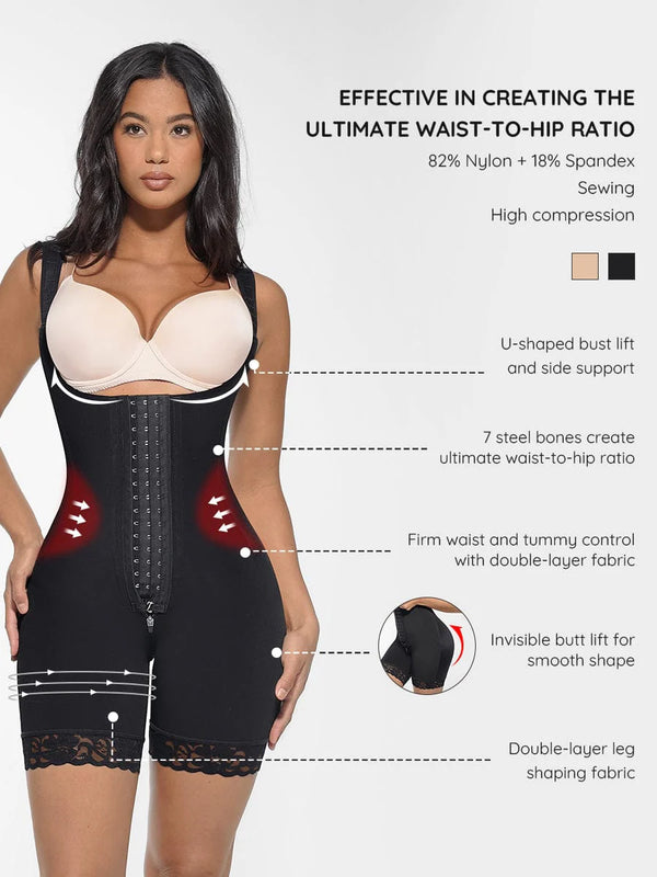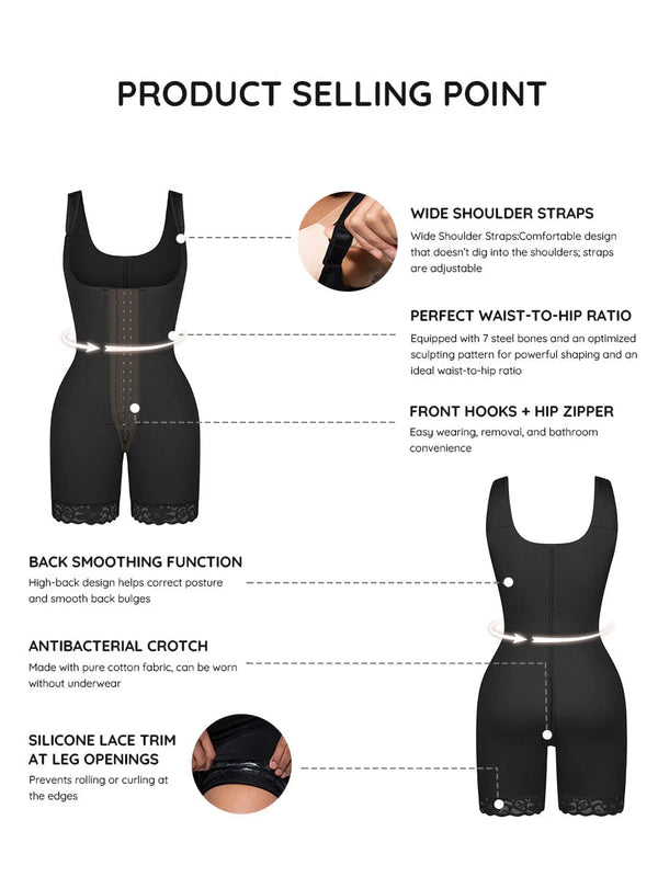 Invisible butt-lift contouring enhances curves naturally, while double-layer leg panels help slim and shape the thighs. Adjustable wide shoulder straps ensure comfort without digging in. Finished with anti-slip lace leg openings, an antibacterial cotton crotch, and a full front hook-and-zip closure for easy wear and restroom access.