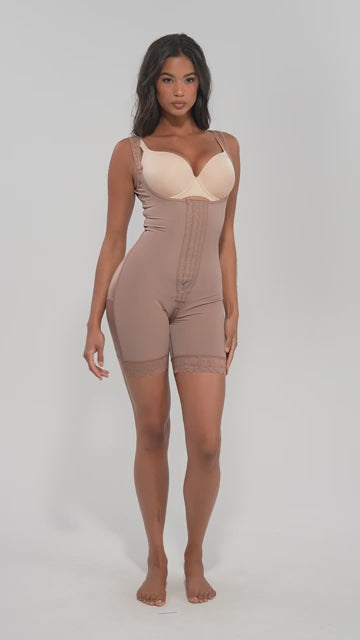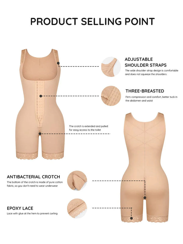 Wide adjustable shoulder straps ensure comfort without digging in, while anti-slip lace leg openings keep everything securely in place. Finished with a cotton-lined antibacterial crotch and extended opening for easy bathroom access, this shaper is thoughtfully crafted for post-recovery wear or everyday firm sculpting.