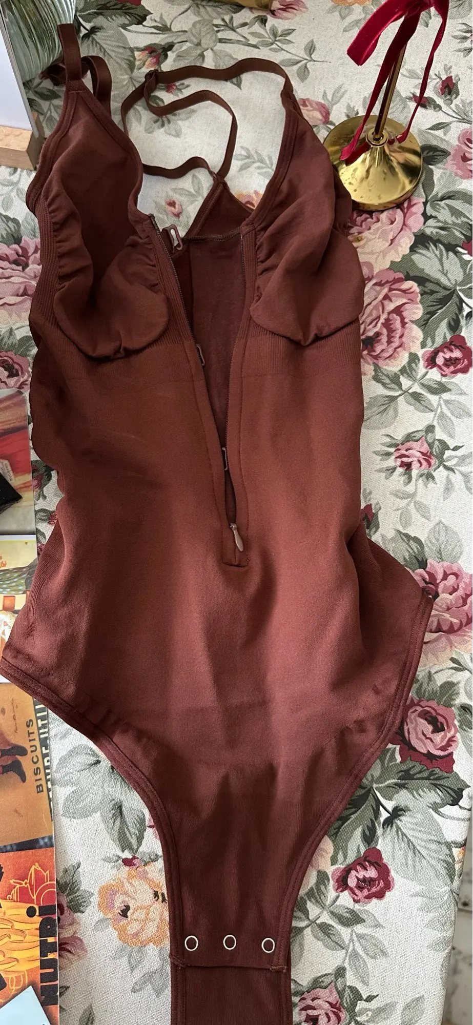 A sculpting bodysuit designed to smooth, support, and contour with an invisible finish. A padded internal zipper with hook reinforcement allows for easy wear while remaining soft and comfortable against the skin. The built-in, three-dimensional bust support shapes and lifts naturally — no bra required — with full coverage that stays seamless under clothing.