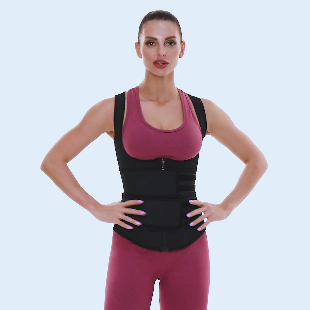 A high-compression latex vest waist trainer designed to sculpt your waist, flatten the tummy, and enhance your natural curves with adjustable, targeted shaping. Featuring a secure front zipper and dual adjustable belts, this trainer delivers customizable compression for a snatched, contoured silhouette.